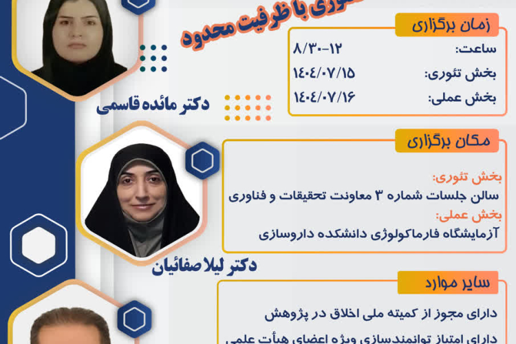 با توجه به نامه شماره 4/2999/د مورخ 1404/07/06 معاونت محترم تحقیقات و فناوری دانشگاه علوم پزشکی استان اصفهان مبنی بر برگزاری کارگاه تئوری عملی با عنوان «ملاحظات اخلاقی در کار با حیوانات آزمایشگاهی » /با دریافت هزینه/، در روز های سه شنبه و چهارشنبه 15 و 1404/07/16، بدینوسیله مراتب جهت اطلاع همکاران ذی ربط اعلام می گردد .
