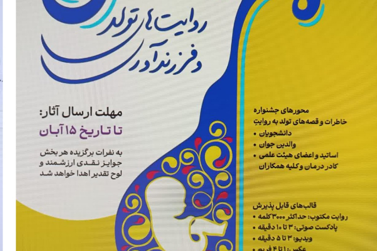 با توجه به نامه شماره 5/2102 / د مورخ 1404/07/23 معاونت محترم فرهنگی دانشجویی وزارت بهداشت درمان و آموزش پزشکی در خصوص برگزاری جشنواره «هم نفس؛روایت تولد و فرزنداری » در راستای خمایت از خانواده و جوانی جمعیت و با توجه به اهمیت موضوع ، به پیوست پوستر و فایل فراخوان و دستورالعمل برنامه جهت اطلاع و بهره برداری علاقمندان بارگذاری می گردد.
