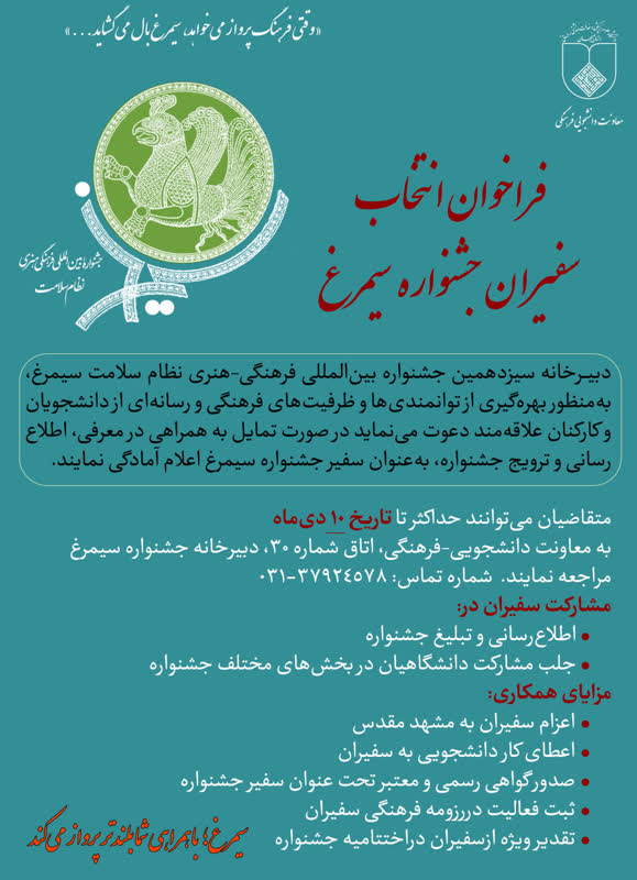 با توجه به نامه شماره 3132 مورخ 1404/10/07 معاون محترم دانشجویی دانشگاه علوم پزشکی ، به اطلاع می رساند سیزدهمین جشنواره بین المللی فرهنگی هنری نظام سلامت سیمرغ برگزار می گردد. لذا فایل آیین نامه ، پوستر و فراخوان سفیران جشنواره جهت آگاهی و اطلاع همکاران علاقمند بارگذاری می گردد. فراخوان سفیران.jpg ـــ آیین نامه سیمرغ نهایی.pdf